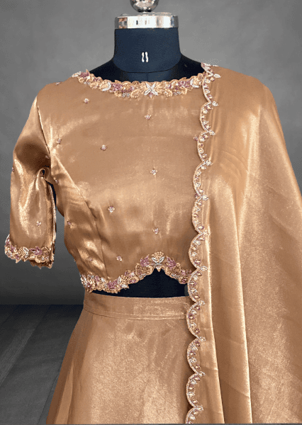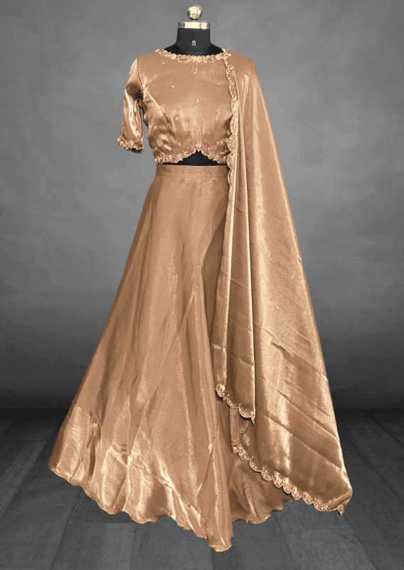Brown Shimmer Georgette Lehenga Set is perfect for teen girls who love subtle shine and classic charm. The plain shimmer skirt is paired beautifully with a hand-embroidered blouse and dupatta, making it a graceful choice for festive and family occasions.