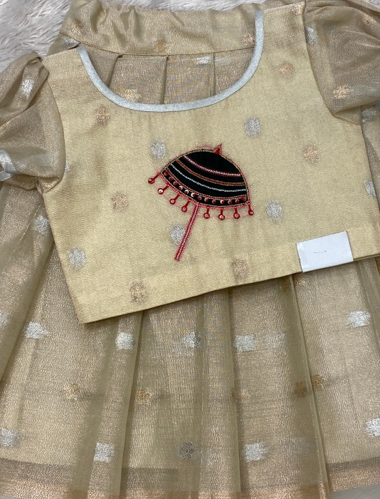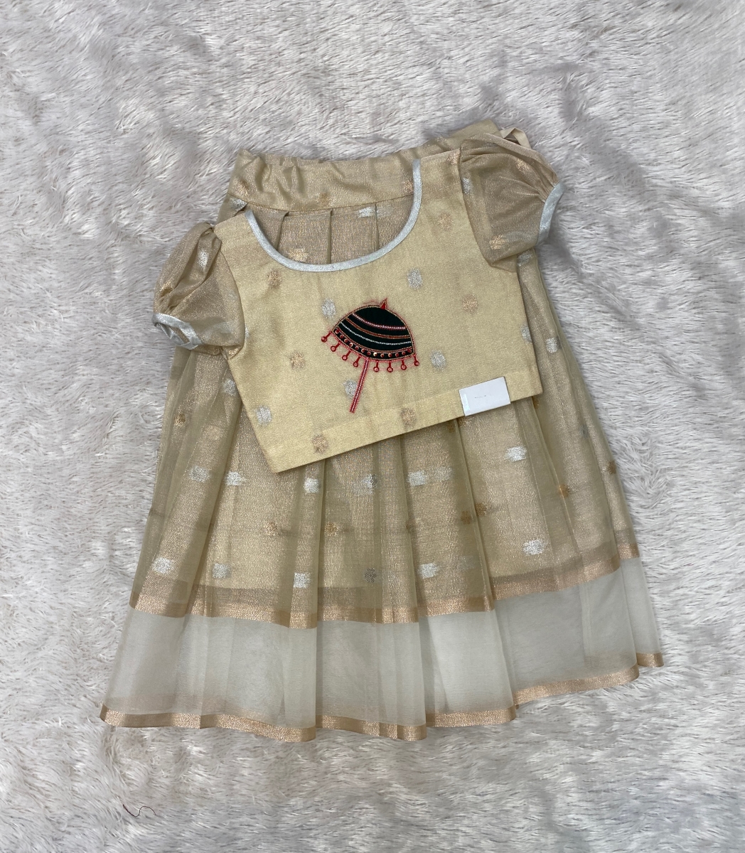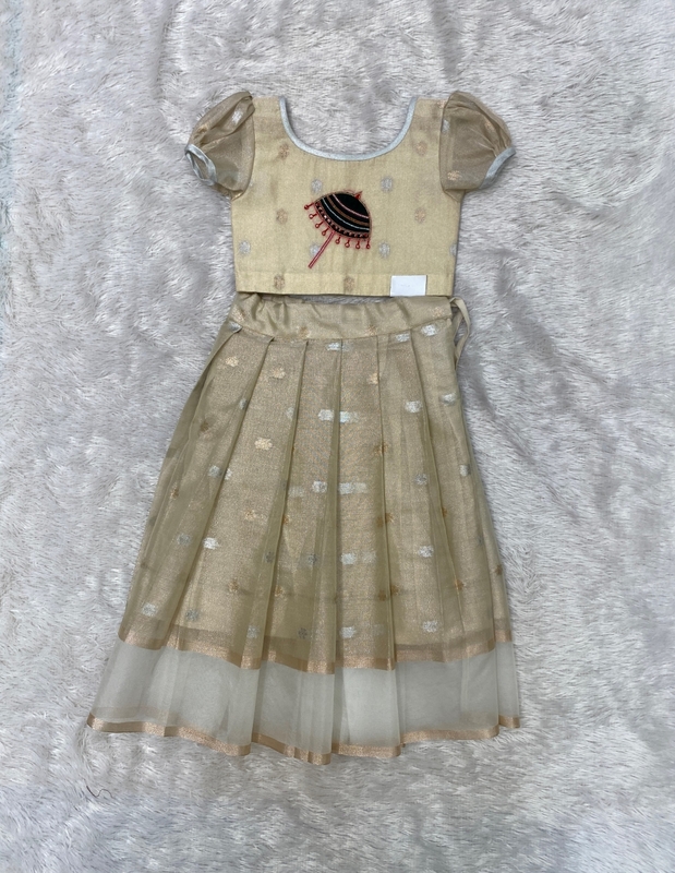 Semi tissue pattu pavada for kids, designed in soft gold-toned fabric with subtle shimmer. Perfect for Onam, temple visits, and festive occasions, it offers a graceful look with all-day comfort.