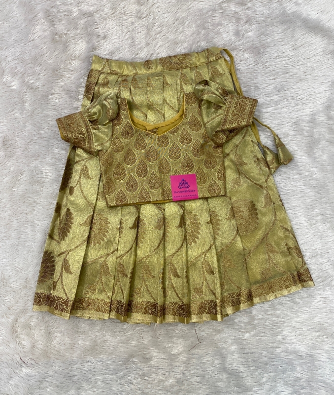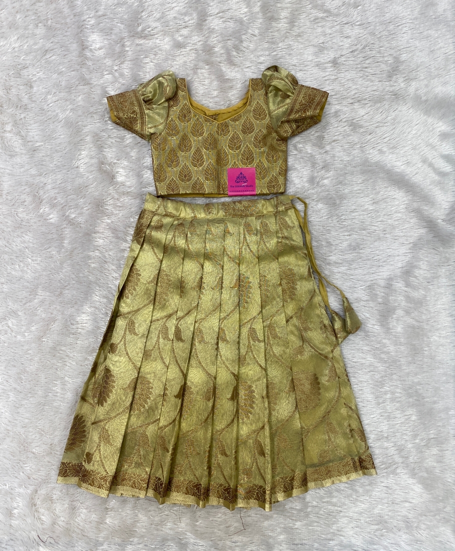 Gold semi tissue lehenga for kids features a soft shimmer and festive flair, perfect for weddings, cultural functions, and special occasions. Lightweight and elegant, it adds a royal charm to every twirl.