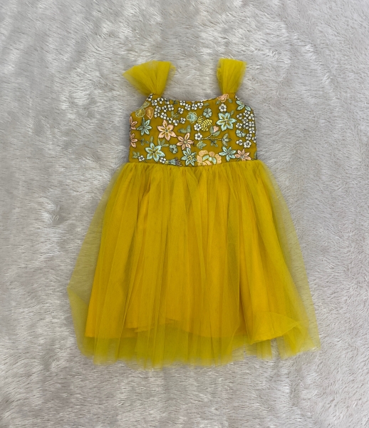This radiant yellow gown is designed for little fashionistas who love to shine at parties. Crafted in soft net fabric, the gown features delicate embroidery on the chest portion, adding a touch of elegance and festive flair.