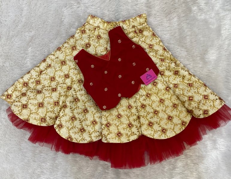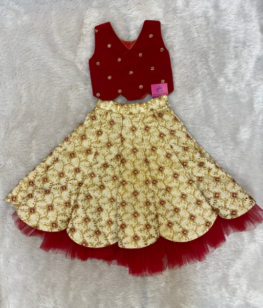 The rich red velvet short top adds a royal touch, while the gold-toned embroidered skirt brings in festive sparkle. Perfect for birthdays, weddings, and special occasions, this outfit is designed to keep your child stylish and comfortable.