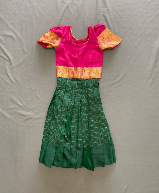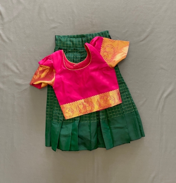 Shop this cute Pink Silk Top paired with a Bottle Green Skirt for kids. A perfect traditional wear choice for weddings, festivals, and family celebrations.