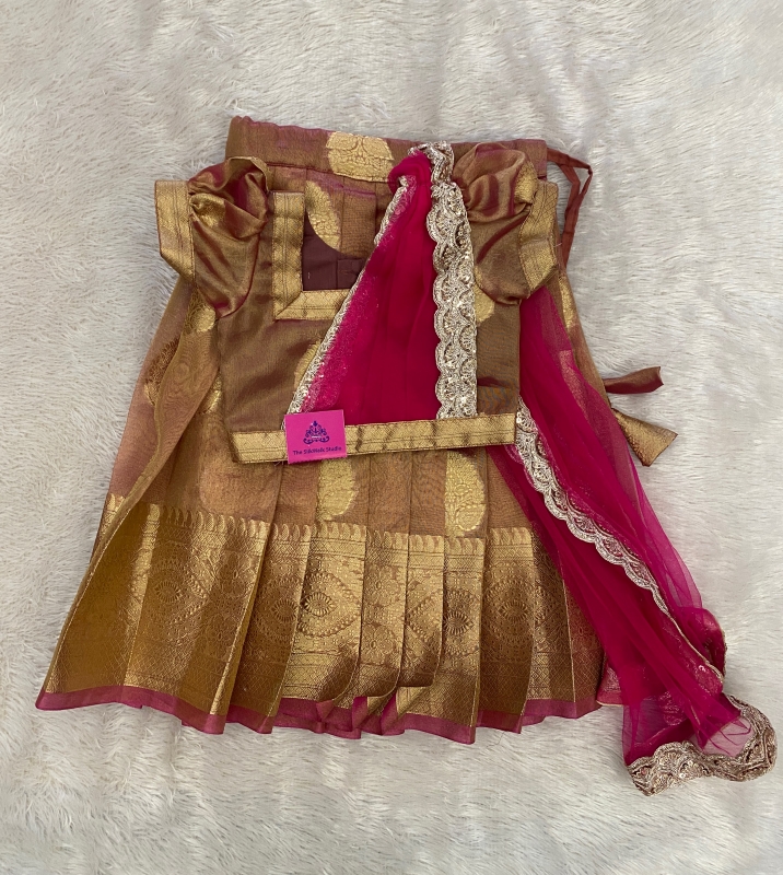 A charming and regal lehenga set for little girls, featuring a shimmering gold semi tissue lehenga paired with a soft pink net dupatta that can be easily attached or removed. .