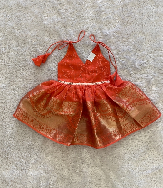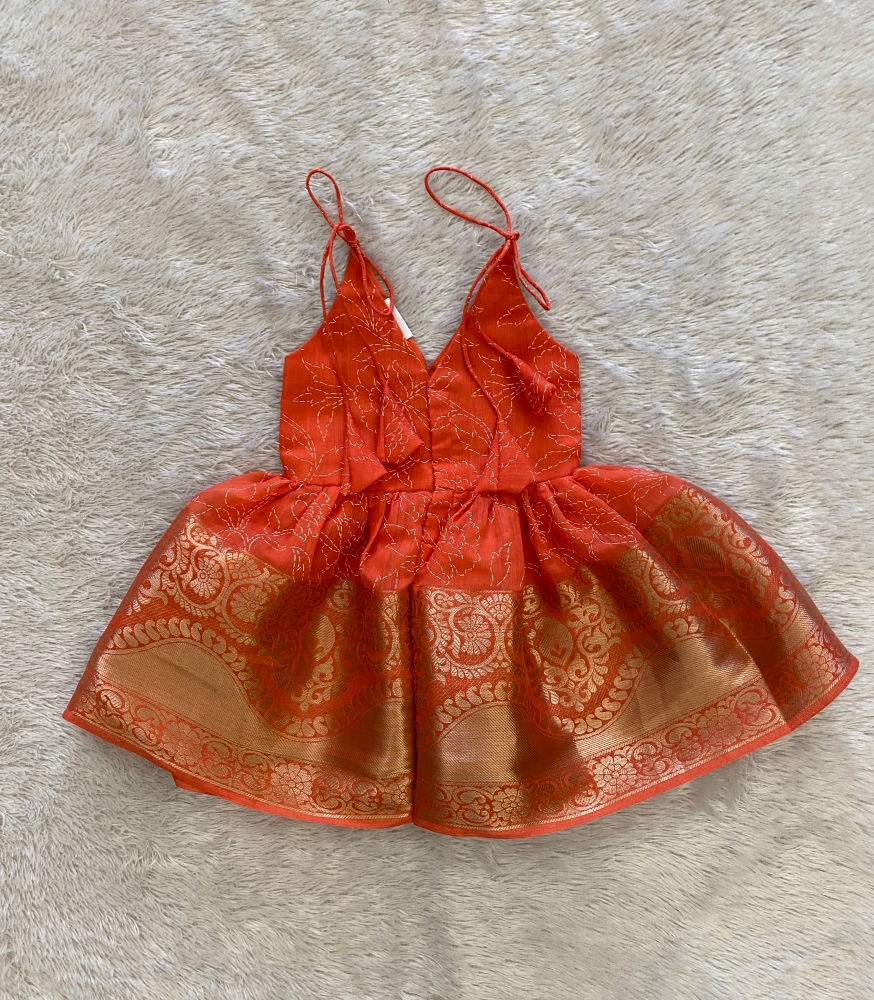 Bright and cheerful, this Orange Cotton Frock features delicate strap-style sleeves that add a breezy, playful touch. Crafted in soft, breathable cotton, it’s perfect for keeping kids comfortable during warm days and active outings.