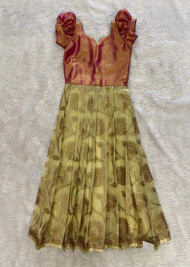 A beautifully crafted frock made from soft semi tissue fabric, designed to offer both style and comfort. The gentle sheen of the fabric adds a festive glow, making it ideal for birthdays, weddings, and special events.