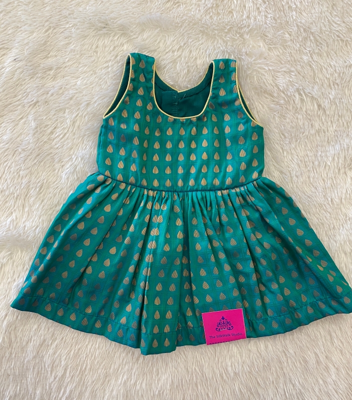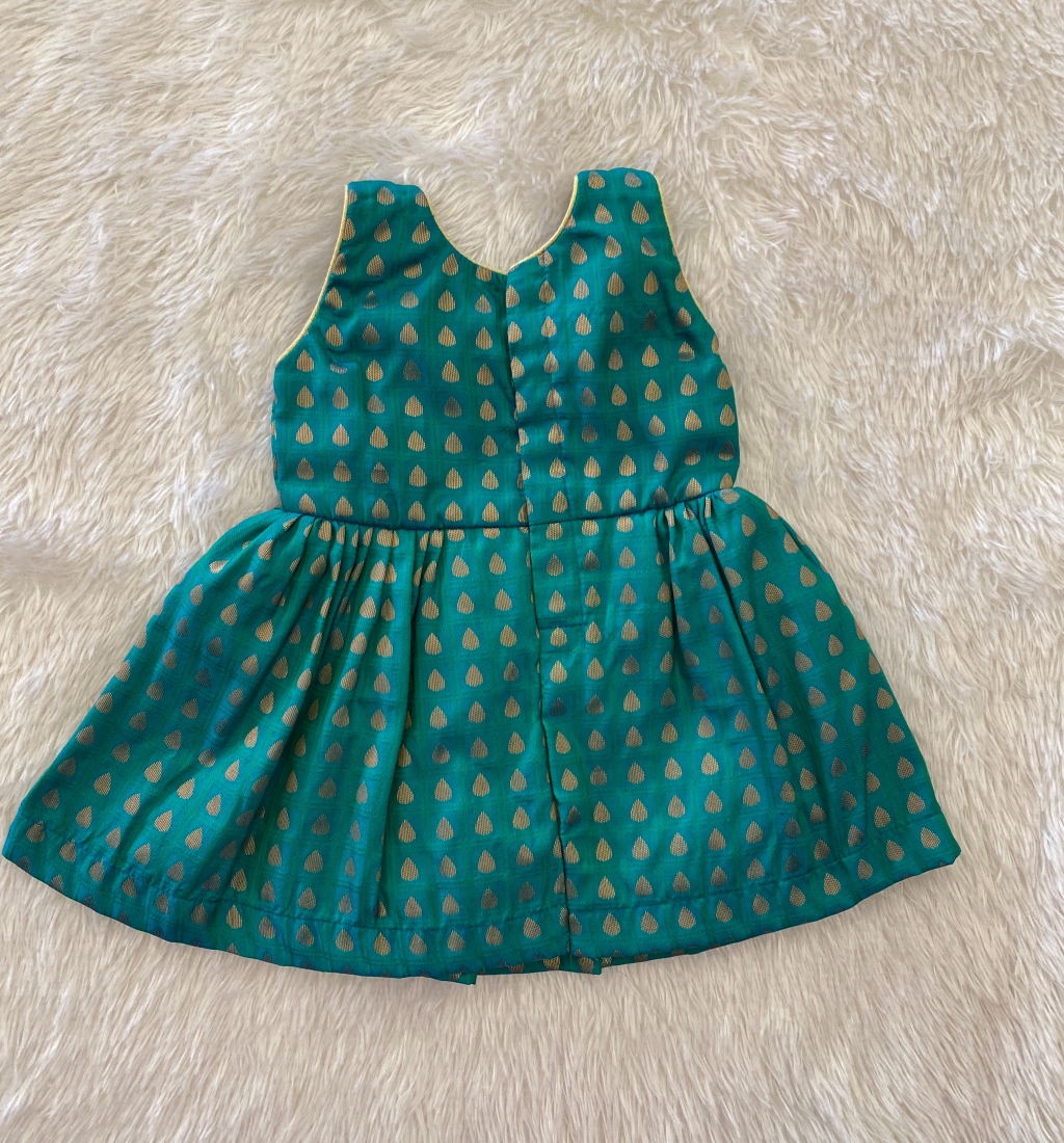 A charming frock designed in soft semi silk, this piece comes in a beautiful green shade with a gentle shine. Ideal for poojas, naming ceremonies, and celebrations, it features baby-safe stitching, soft inner lining, and an elegant silhouette to keep your little girl looking adorable and feeling cozy.